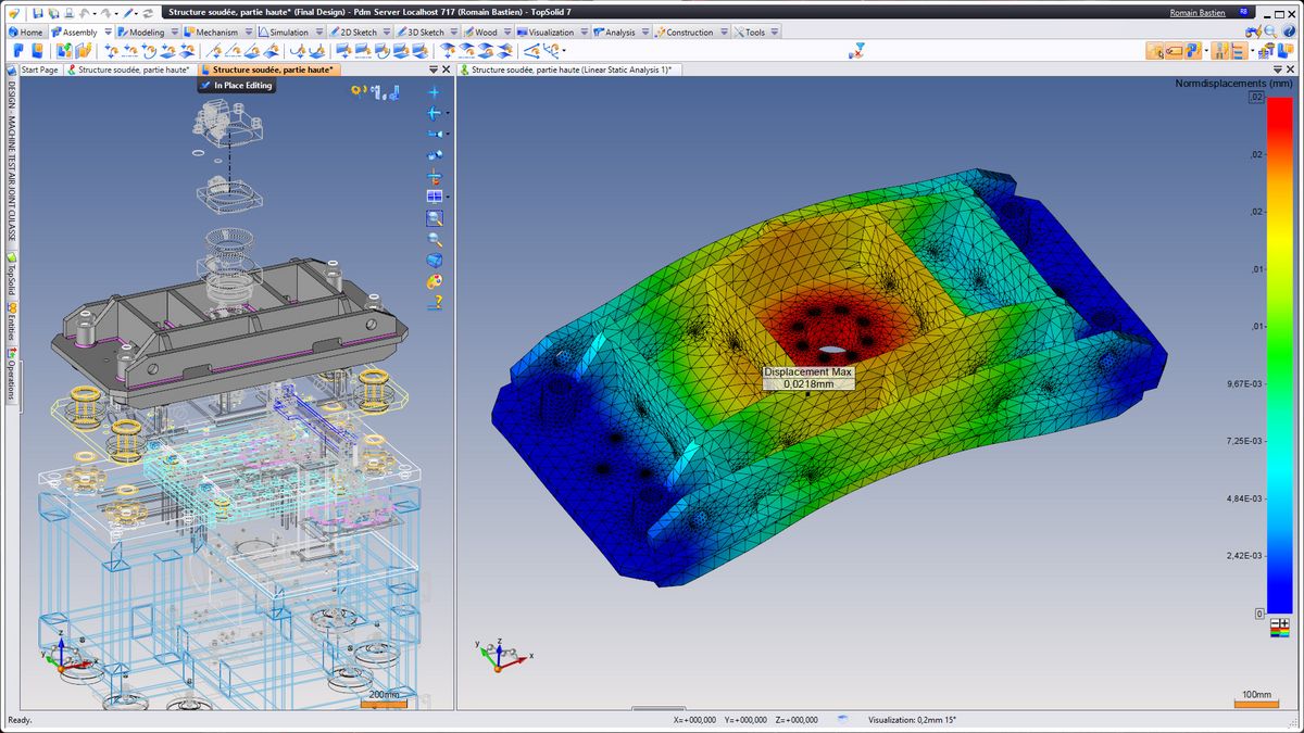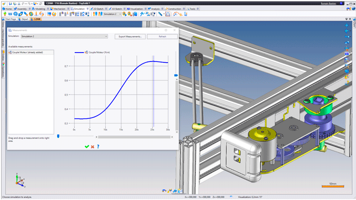 TopSolid'Design proporciona un potente motor de cinemática y dinámica, basado en grupos rígidos y articulaciones mecánicas. Puede aplicarse sobre bocetos sencillos para el diseño conceptual, o sobre montajes en 3D para la simulación final.